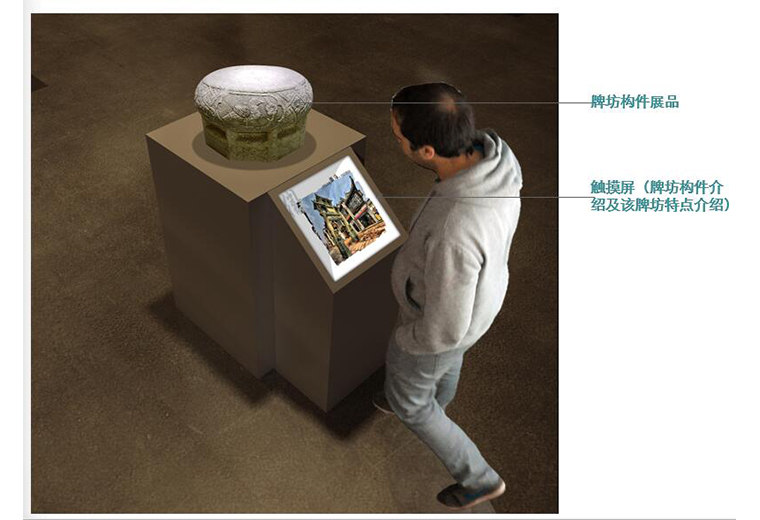 通过静态的展示方式,展示出歙县当地独有的牌坊种类,同时参观者可通过触摸屏来详细了解该展品的详细内容及特色之处。